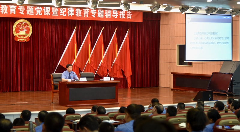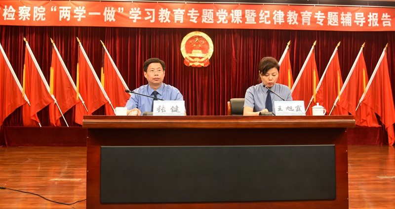 市检察院党组成员、机关党委书记、调研员王旭霞主持“两学一做”专题党课暨纪律教育专题辅导报告。市检察院班子成员、检委会专职委员和全体检察人员聆听了党课报告。