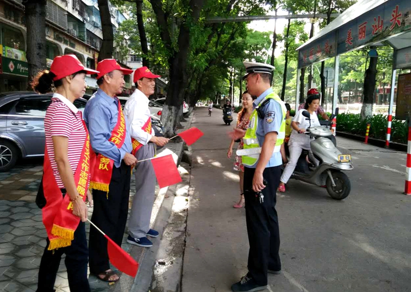 交通路口恰逢高峰期,行人和机动车明显增多,老干部志愿者在交警同志的指导下,有模有样地“执勤”起来,对行人乱穿马路、摩托车穿梭逆行等不文明行为进行劝导、纠正,提倡群众自觉养成文明行车、文明乘车、文明出行的良好习惯,确保自身安全和行为安全。