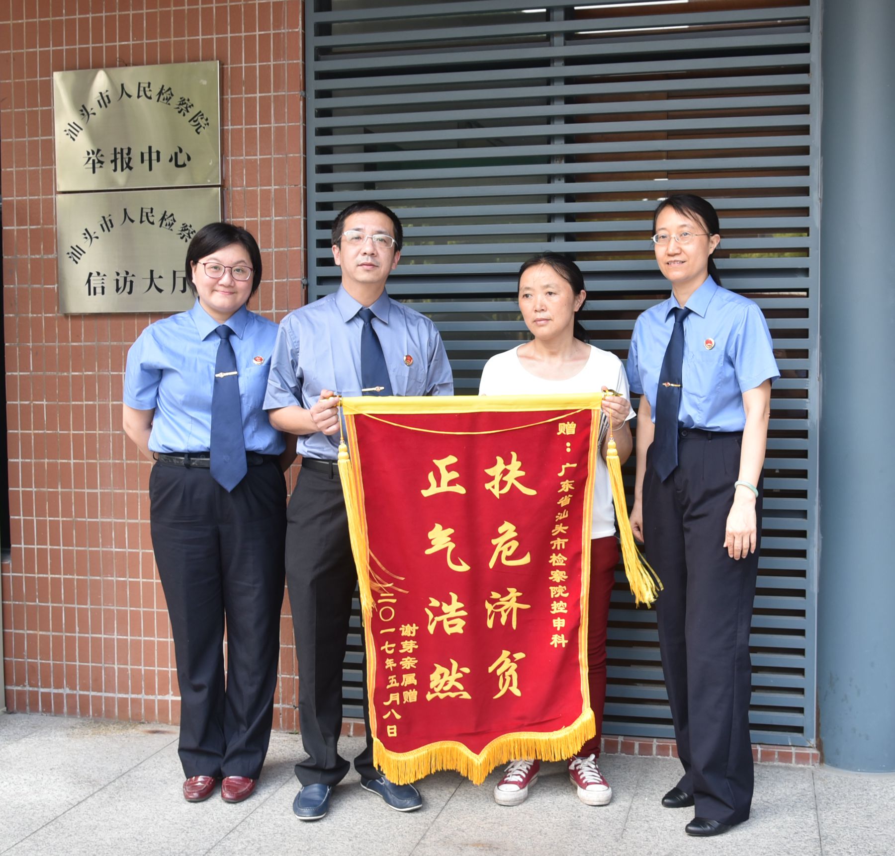 “感谢政府!感谢检察院!感谢你们有心人一路给予的帮助!在申请司法救助过程中,办案人员一直为我们争取,也总是耐心地开导我们,实在是太感谢你们了……”拿到救助金时,被害人谢某的母亲攥紧装有救助金的信封,含泪连声道谢。谢某一家还向市检察院赠送写有“扶危济贫,正气浩然”的锦旗。他们表示,这一份沉甸甸的司法救助,无疑为他们一家带来了希望的曙光,他们一定会克服困难,坚强乐观面对生活,心怀感恩,回报社会。