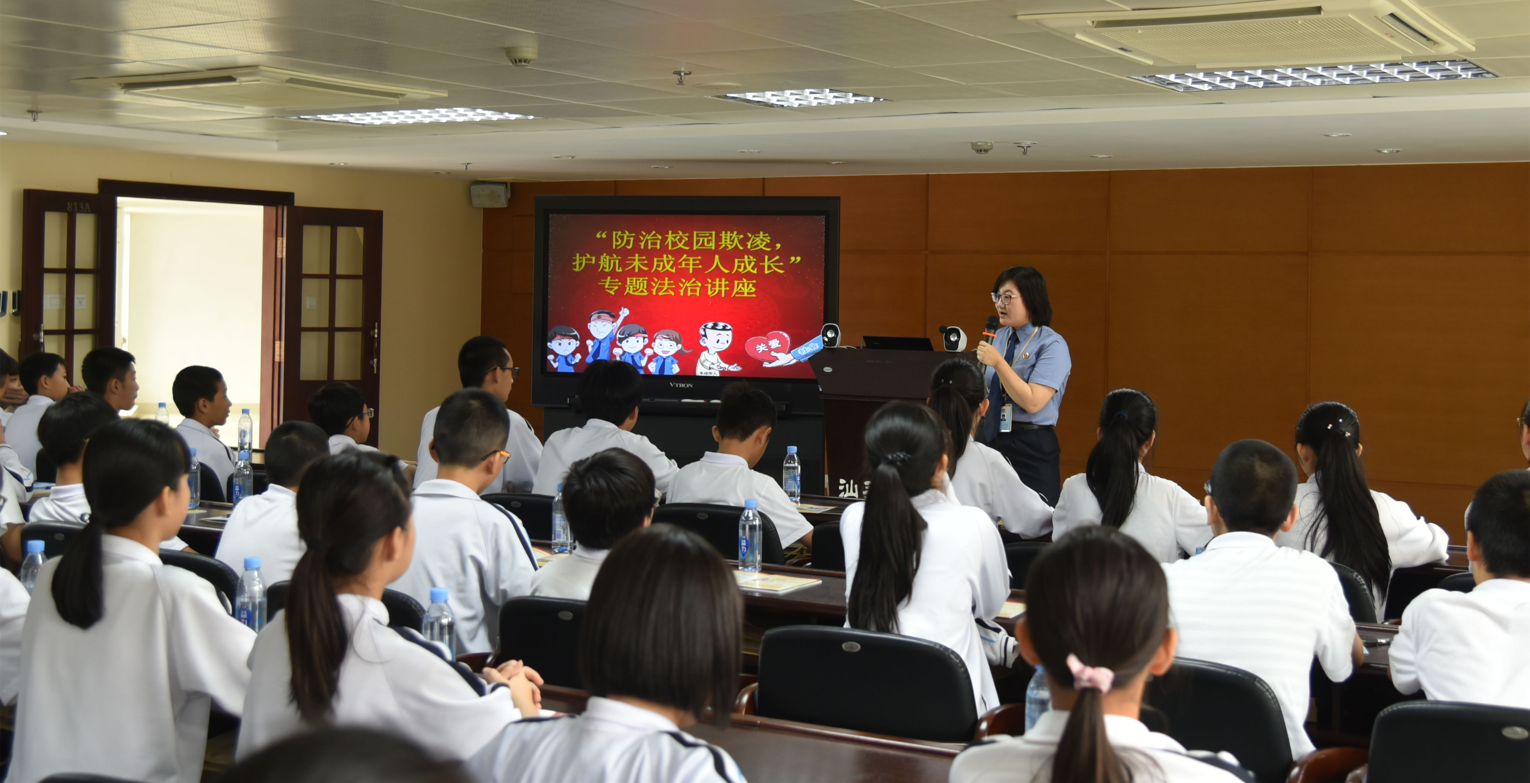 为切实提高在校学生法治意识和自我保护能力,有效预防校园欺凌,维护未成年人的合法权益,5月26日上午,市检察院在八楼培训大厅举办“防治校园欺凌”专题法治讲座,应邀参加“检察开放日”活动的龙湖区丰华学校60名学生聆听了法治讲座。讲座中,授课检察官运用生动活泼的语言,从自己的亲身经历和办案实践出发,结合发生在校园周边、学生身边的案例,通过浅显易懂的法律分析以案释法,向学生介绍了什么是校园欺凌、产生校园欺凌的原因、校园欺凌的类型、校园欺凌行为涉嫌的犯罪,以及面对校园欺凌和违法侵害时如何自我保护等方面的知识。同时希望同学们要换位思考,做到“己所不欲,勿施于人”,要学会“保护自己,关爱他人”,呼吁大家踊跃加入到汕头全城“创文”的热潮中,人人都当礼貌少年,个个共建文明校园!