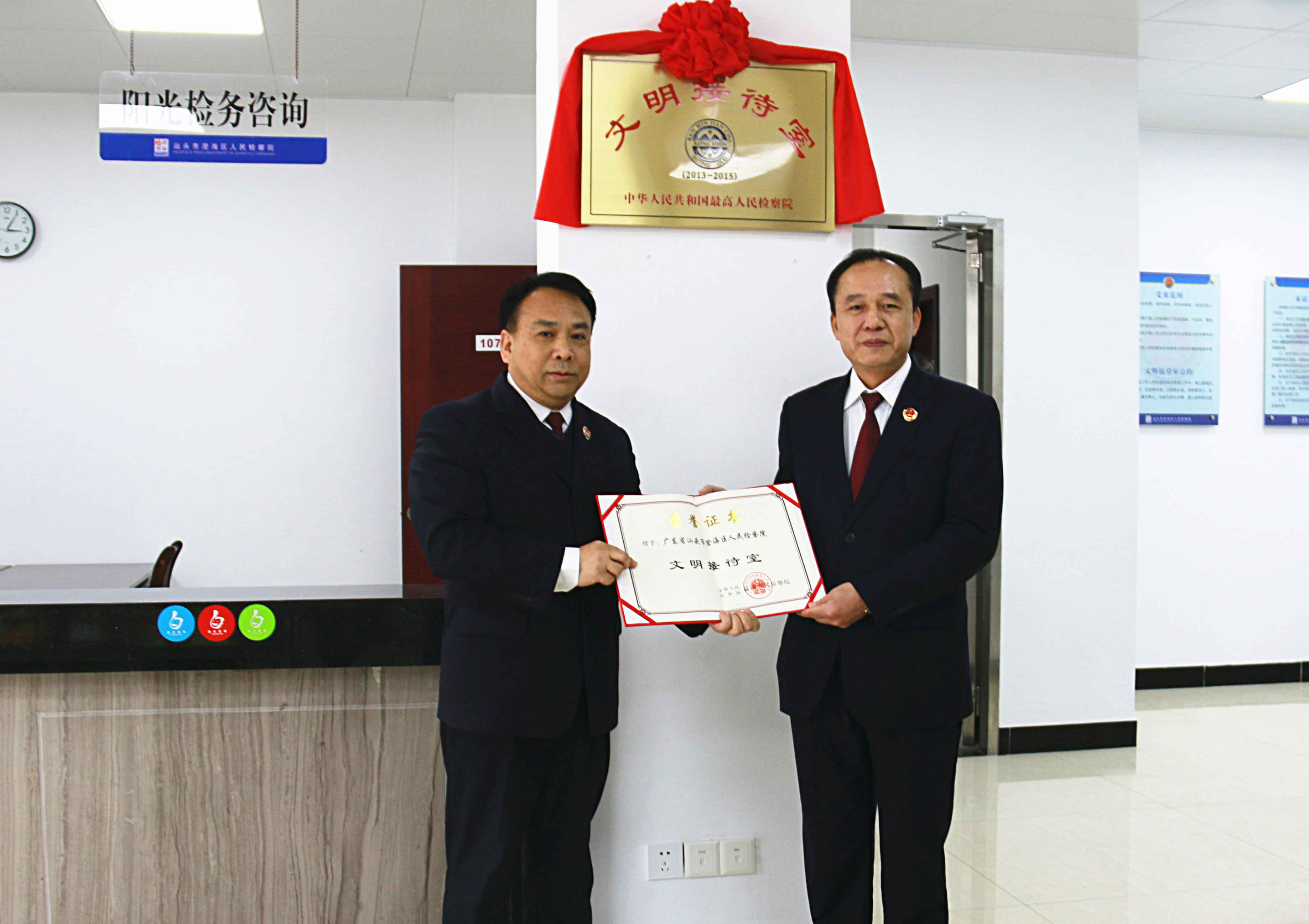 挂牌仪式上,省检察院控告检察处副处长卢小珏宣读最高检《关于表彰第九届全国检察机关文明接待室的决定》,颁发表彰证书,并与澄海区检察院检察长陈武松共同为“全国检察机关文明接待室”揭牌。市检察院副检察长林列坤参加挂牌仪式。
