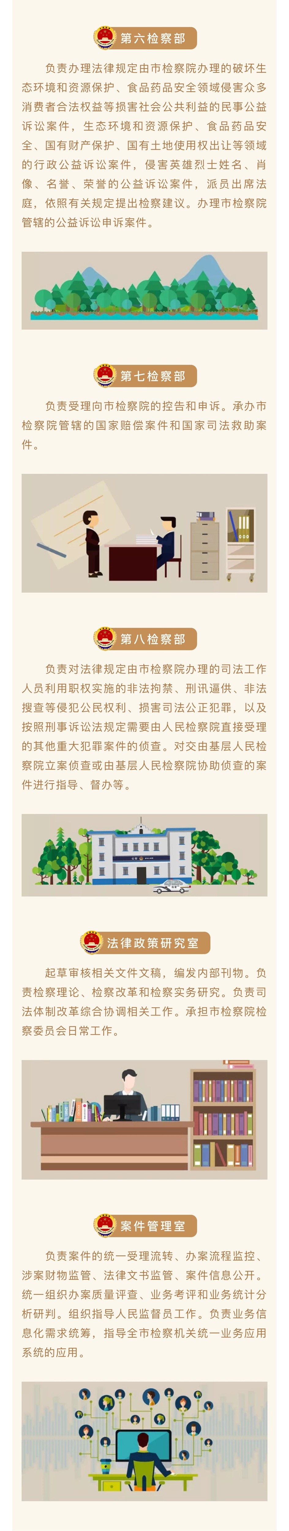 目前,汕头市检察院共设置16个内设机构,包括8个检察业务部门(第一至第八检察部)、3个综合业务部门(法律政策研究室、案件管理室、检务督察部)、4个综合行政部门(办公室、政治部、计划财务装备科、司法警察支队)和1个派驻机构(驻市看守所检察室)。接下来就让小编带你一图读懂检察院内部的各位“数字君”和它的小伙伴们吧。