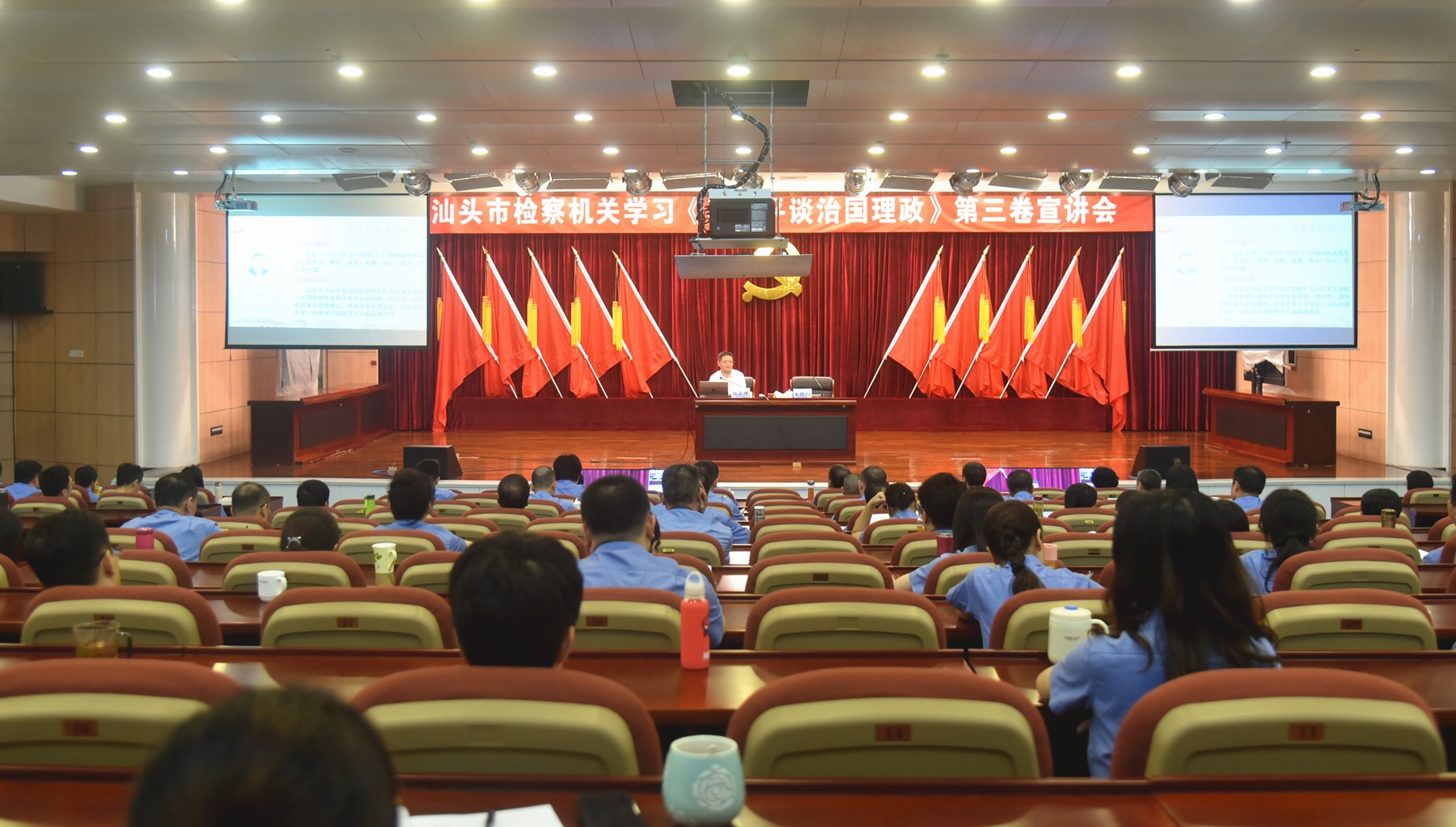 专题辅导深刻阐释了《习近平谈治国理政》第三卷的重大意义、主要内容和鲜明特征,授课逻辑严密、脉络清晰、内容丰富,有助于全体党员干警深刻把握习近平新时代中国特色社会主义思想的核心要义、精神实质、丰富内涵、实践要求,更加自觉地做习近平新时代中国特色社会主义思想的坚定信仰者、忠实实践者。会议同时强调,全市两级检察机关要提高政治站位,以高度的责任感使命感抓实抓好学习宣传贯彻工作,坚持一体化学习,营造浓厚学习氛围,紧密结合检察工作实际不断深化学习习近平新时代中国特色社会主义思想,积极促进成果转化,推动广大党员干警真学、真信、真懂、真用,为确保完成决胜全面建成小康社会、决战脱贫攻坚、打赢扫黑除恶收官战、办好“亚青会”等目标任务,加快汕头经济特区发展、建设省域副中心城市、打造现代化沿海经济带重要发展极贡献检察智慧和力量,奋力谱写汕头检察事业新篇章。