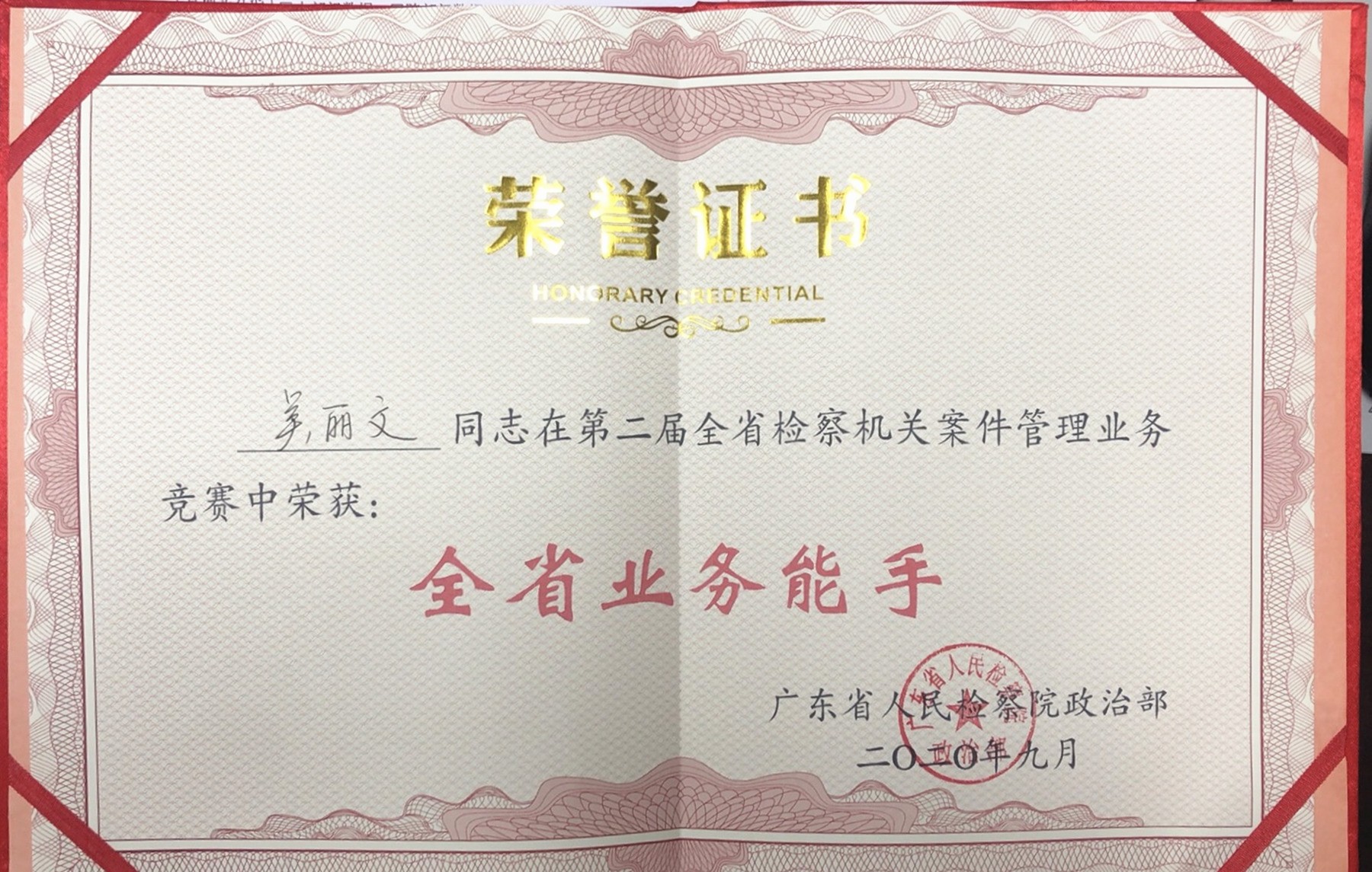9月21日至25日,省检察院举办全省案管业务竞赛,本次竞赛采用综合笔试、上机操作、现场答辩等形式进行,全面考察选手的政策水平、法律功底和系统操作等业务水平,同时注重选手分析研判、逻辑思维和沟通协调等综合能力,充分体现新时期检察机关案件管理“全科医生”的素能要求。经过三天四轮的激烈比拼,我市选手金平区院吴丽文同志获得“第二届全省检察机关案件管理业务能手”称号。
