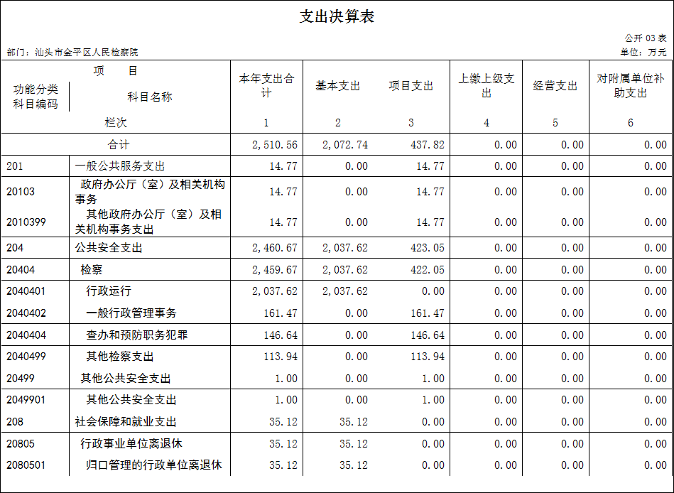 汕头市金平区人民检察院2017年度总支出2940.64万元,其中本年支出2510.56万元。具体情况如下: